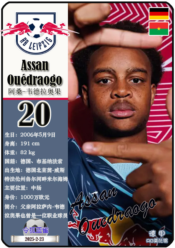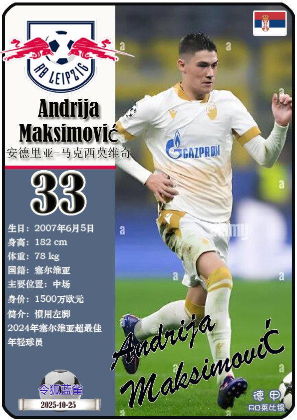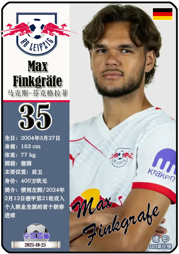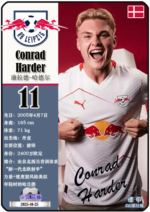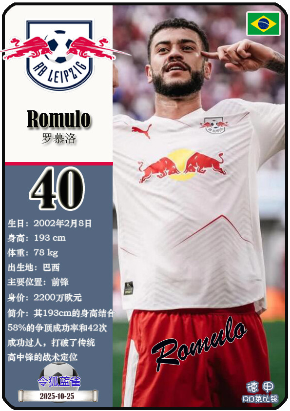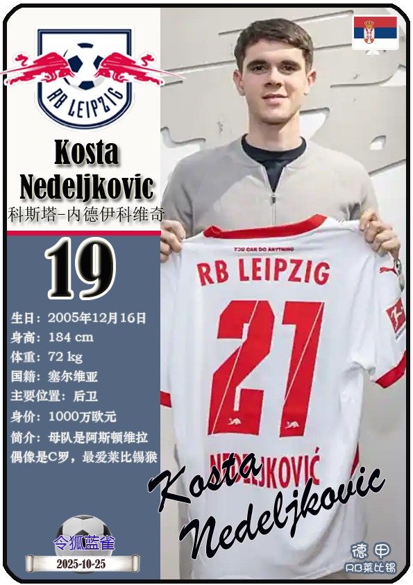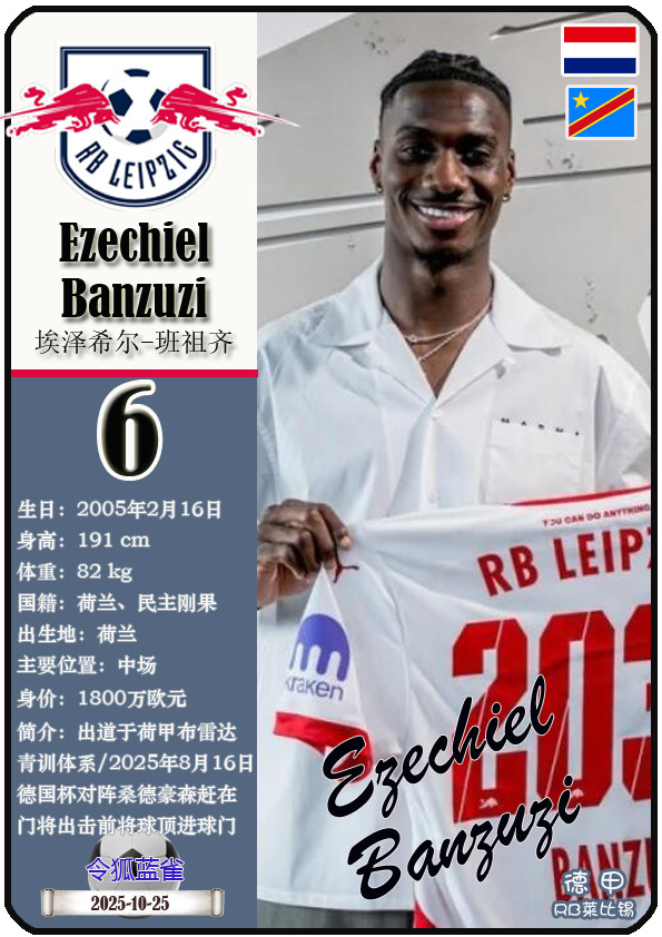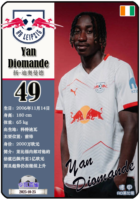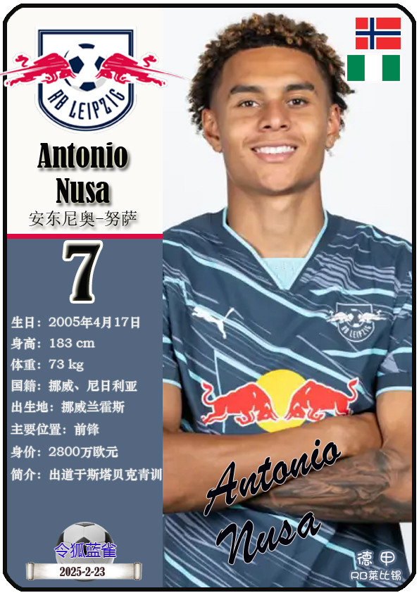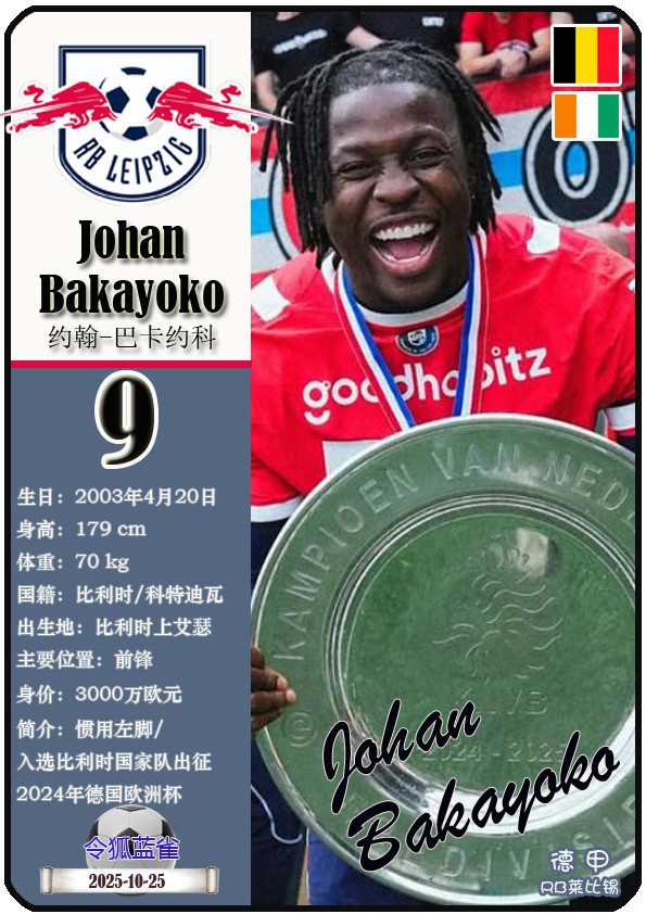 德甲RB莱比锡足球俱乐部成立于2009年5月19日,距今已有16年历史。截至2025年10月25日,球队主教练是奥勒-维尔纳,队内拥有球员约翰-巴卡约科、安东尼奥-努萨、克里斯托弗-鲍姆加特纳等。本期以球星卡的形式展示目前德甲RB莱比锡足球俱乐部的25名球员(按球衣号码排序):